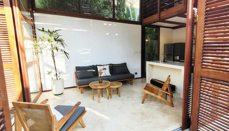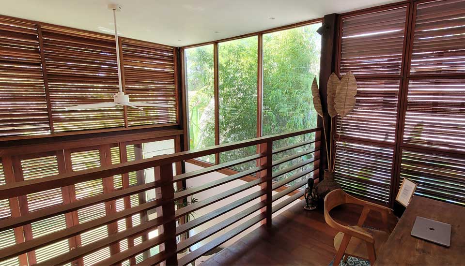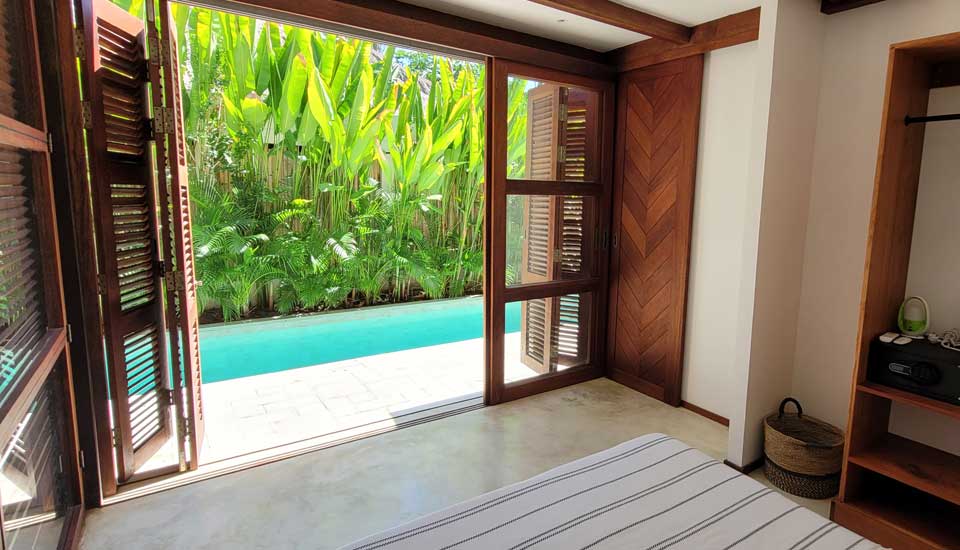 Our private pool villa is made almost entirely of wooden slats, each of which has been hand-crafted. This allows the ocean breeze to flow through the house and protects it from the sun, keeping the inside cool. Folding doors and sliding glass windows open fully so you can enjoy the view across the island’s lush tropical landscape directly from the upstairs bedroom, or jump into the pool from the downstairs one.